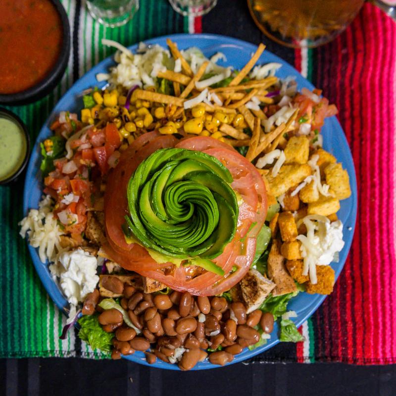 A fried flour tortilla filled with beans, guacamole, sour cream lettuce & cheese.